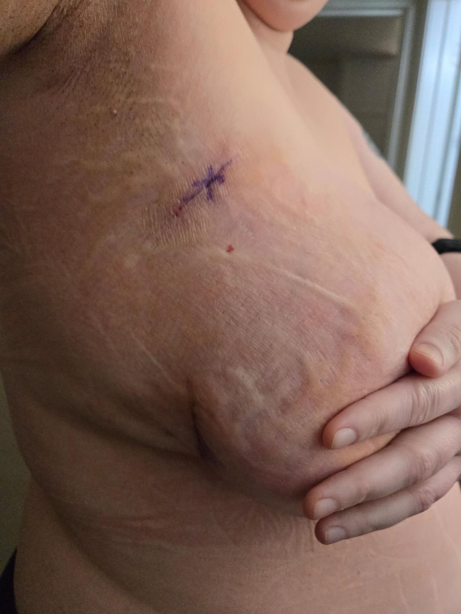 The one thing you can’t see is a deep purple bruise on my side, just behind the breast incision. Also, the imprints on my skin are from the gauze padding and binder, because my skin is so sensitive. They’re not injuries from surgery.