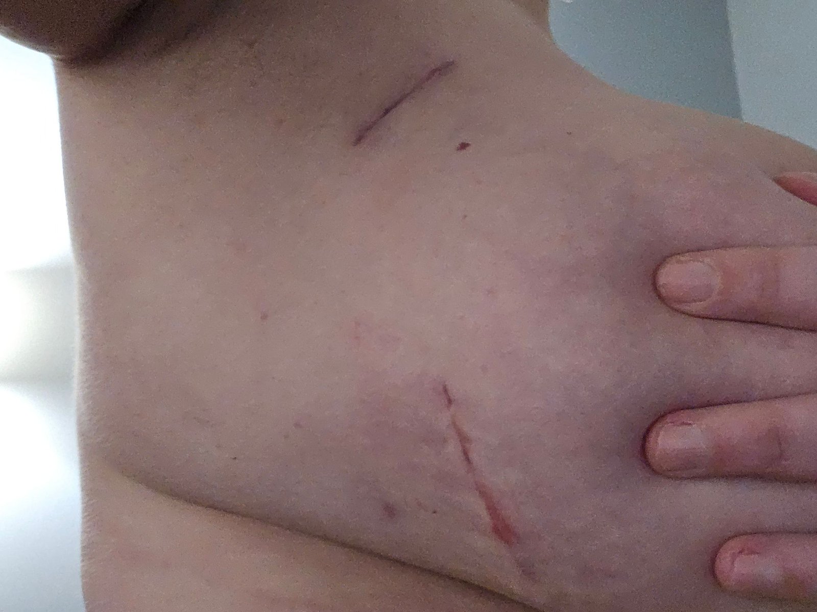 I also used the shower as an opportunity to remove the surgical glue from my incisions. I put some cooking oil on the glue so it could begin to do its thing with the adhesive. I let it sit while I cut my hair. I think it helped with removal. I did kind of a lot of light scrubbing to remove the glue and I think my incisions are a little unhappy now, but I’m sure they’ll feel better soon. It’s pretty cool to be able to see the incisions without all that gunk in the way finally.